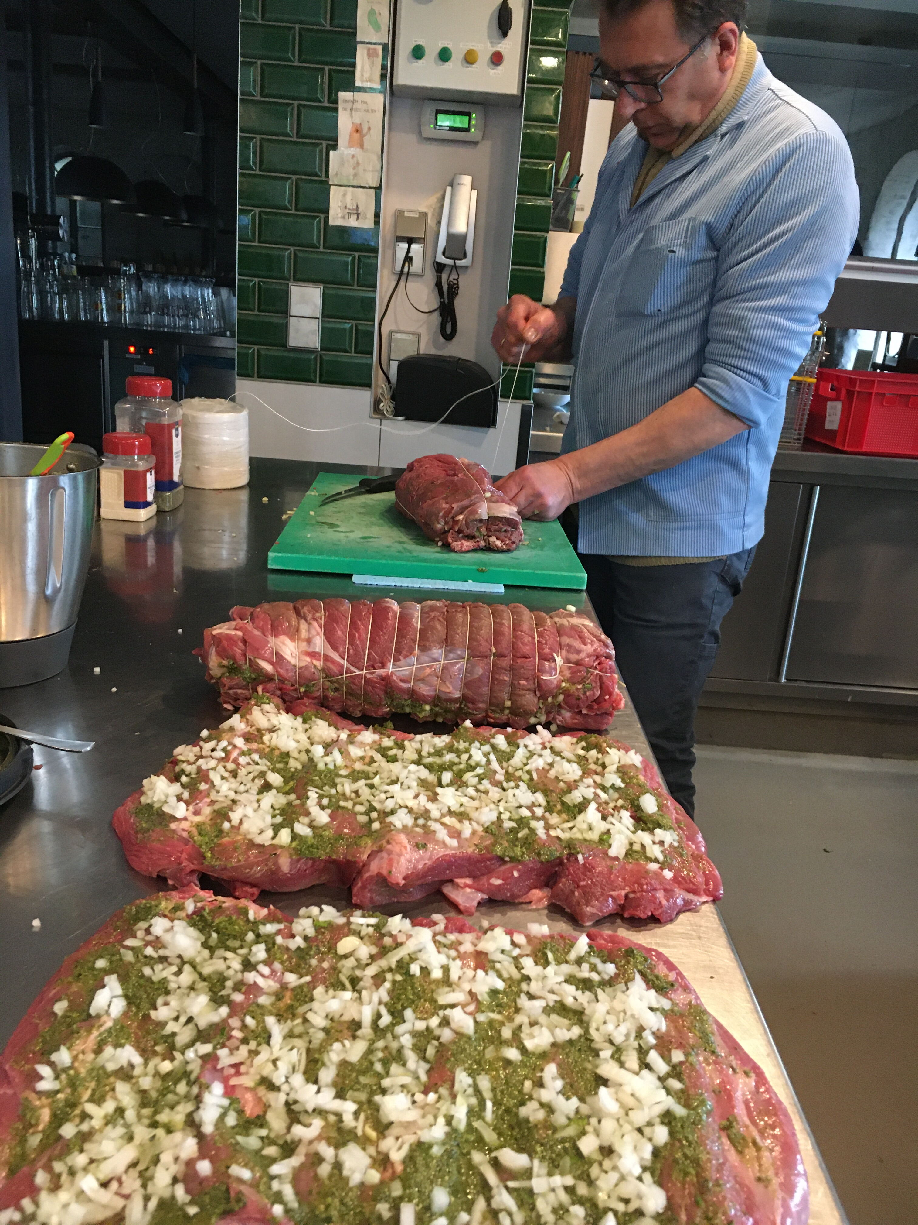 Heute bereitet unser Metzger Kalbsnacken (bzw. genauer gesagt eine Hochrippe vom Kalb) mit Kräuterpanade und Zwiebeln für das kommende Wochenende vor. In welcher Form unser Küchenteam das Fleisch auf den Tellern anrichtet, erfahren Sie am besten, wenn Sie vorbei kommen! Alternativ zeigt Ihnen unsere Karte die aktuellen Gerichte an, sobald diese zur Öffnungszeit online geht: Aktuelle Speisekarte Bornheimer Ratskeller.