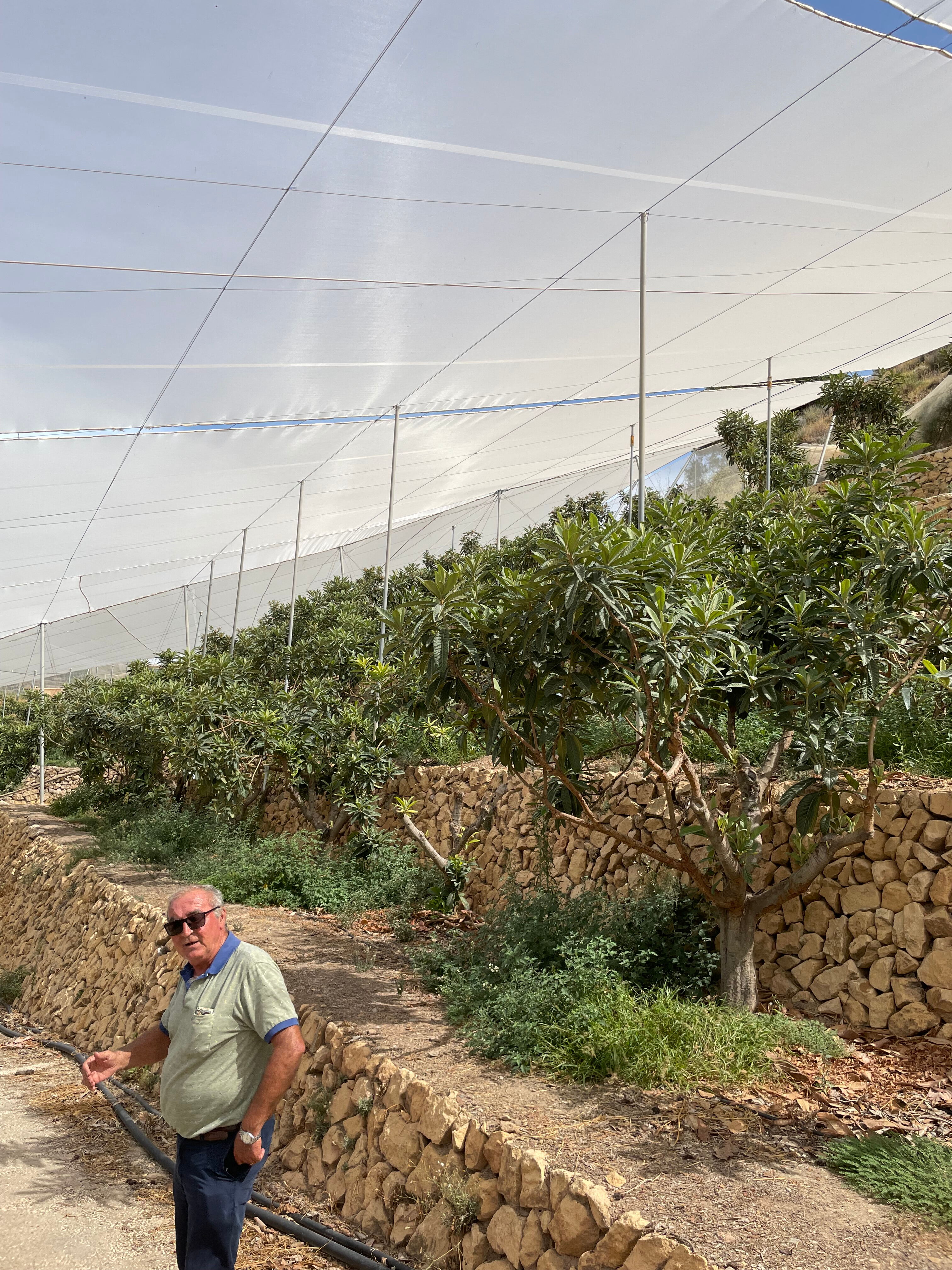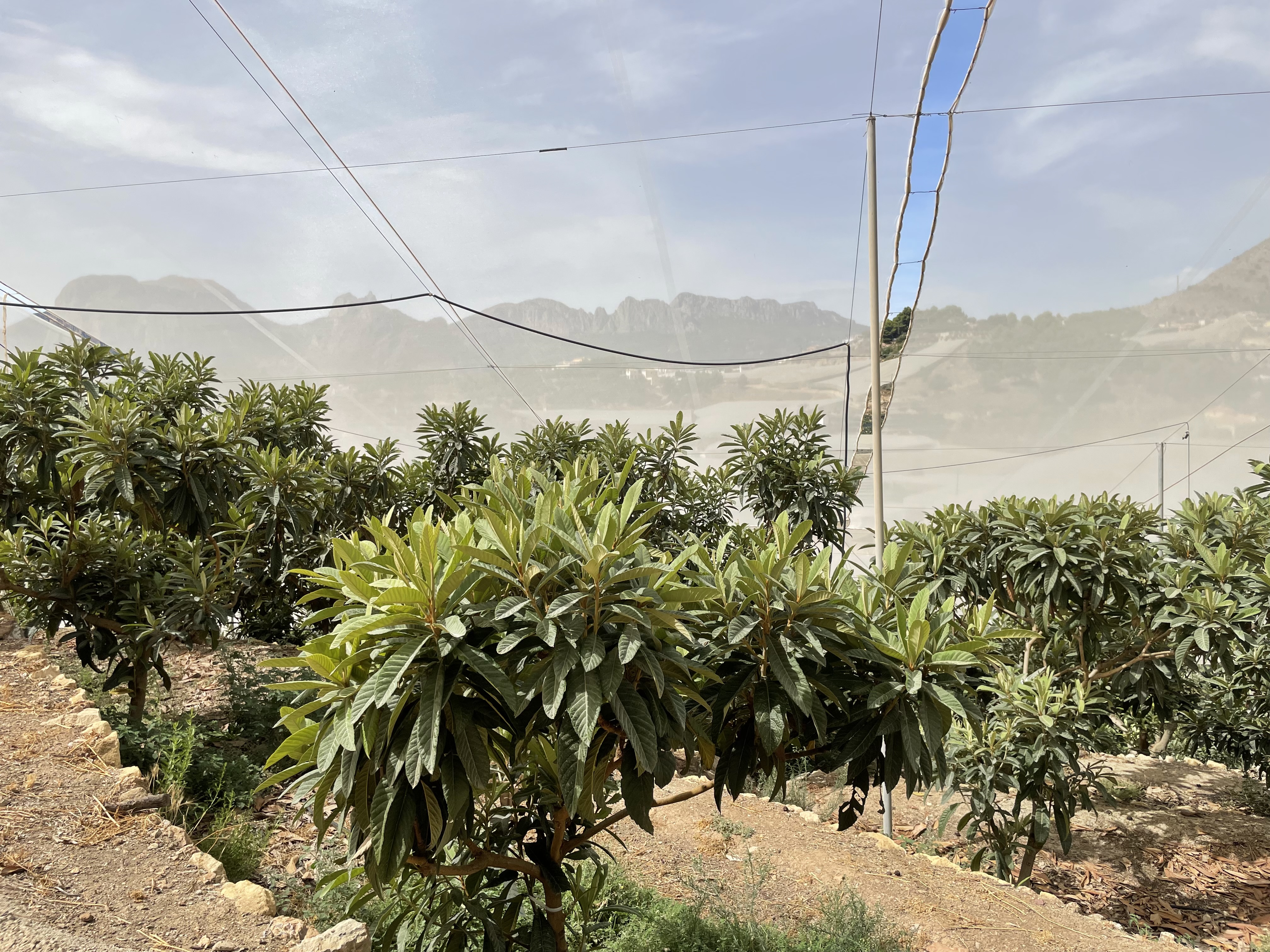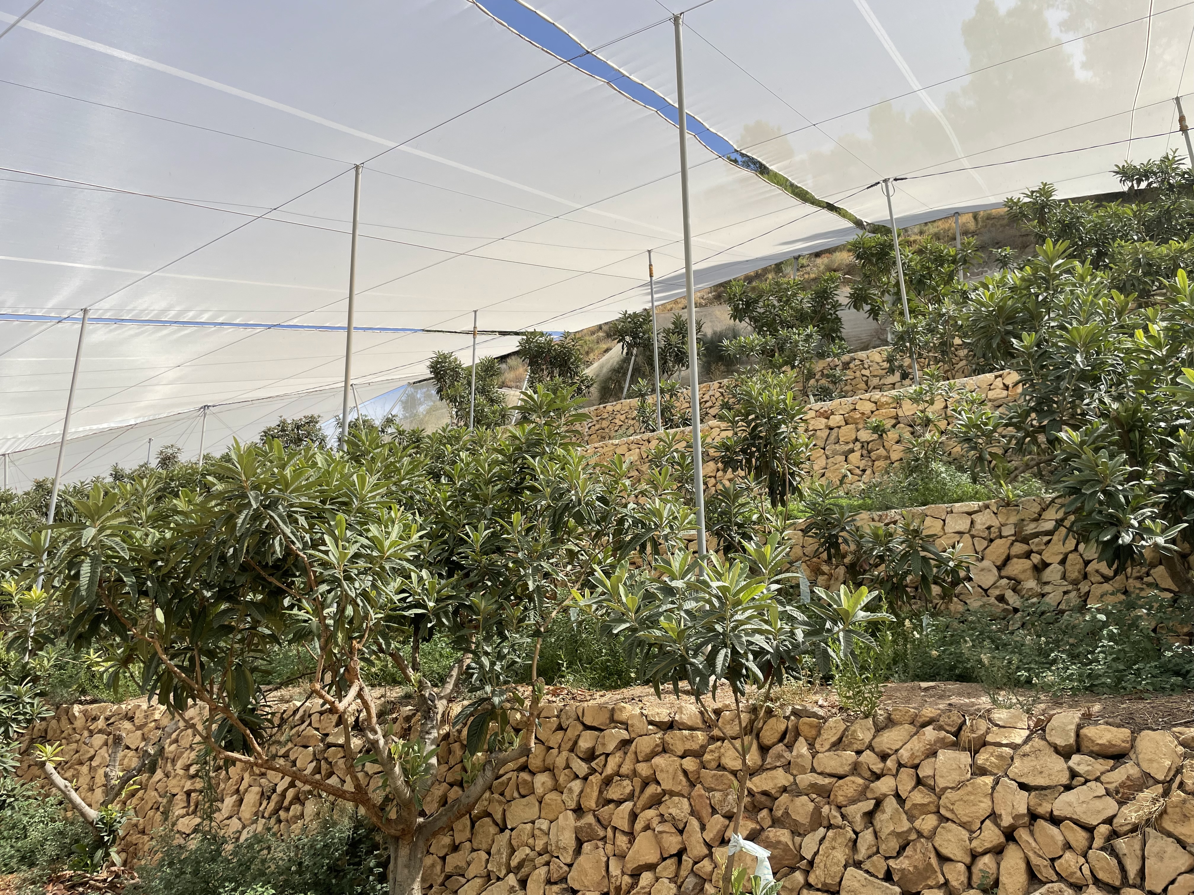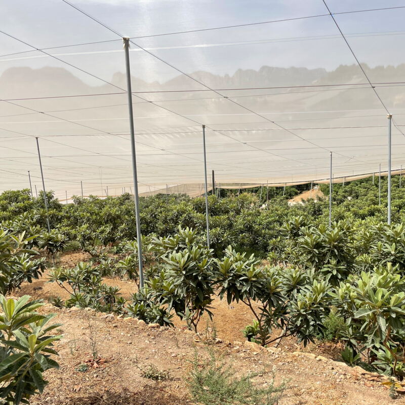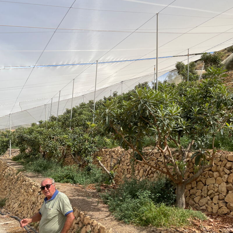 Zum Abschluss dieser digitalen Erzeugerpräsentation muss ich nochmal auf den Anbau zurückkommen, damit man auch die Bilder einordnen kann. Ein Teil der Mispeln wächst unter einer Plane, die 100% Regen und 90% Sonnenlicht, aber so gut wie keinen Wind durchlässt. Der sorgt nämlich für eine höhere Verdunstung. Greift der Wind die Pflanzen aber erst gar nicht an, dann kann der Wasserverbrauch um 25% gesenkt werden. Das ist eine ganz schön große Menge, selbst für eine Region, die für spanische Verhältnisse mit Wasser gesegnet ist (sonst gäbe es dort auch keinen wasserintensiven Reisanbau für Paella). Die einzelnen Bauern entscheiden aber selbst, ob sie die vielen Innovationen, die die Kooperative vorantreibt, umsetzen oder nicht. So entsteht eine bisweilen skurrile Landschaft, deren textile Architektur sofort ins Auge fällt. Gesäumt wird alles durch Orangen- und Zitronenhaine, die jetzt im September kurz vor der Reife stehen. Alles in allem eine etwas ausgedehntere Reise wert, als wir uns das erlauben konnten, nicht zuletzt weil Land und Leute extrem sympathisch sind.